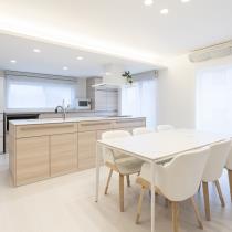 テーブルや椅子、収納もホワイトでトータルコーディネート。収納の扉部分は半透明にし、空間全体のテイスト...