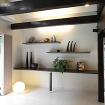 リビングの一角に飾り棚を設置。間接照明もうまく使い、趣きのある空間になっています。