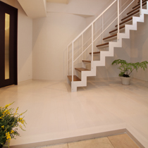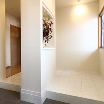 お客様を迎える玄関は、漆喰風の塗装壁。 格調高い雰囲気に仕上がっている。 また、小窓も設置し、暗く...