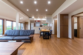 住まいの点検から雨漏りや白蟻被害が判明。大幅な間取り変更もご希望だったことから、基礎と一部の柱を残したスケルトン状態からリフォームしました。日当たりのいい場所にご家族でくつろぐのにふさわしい、明るいLDKをご提案。室内はフラットなバリアフリー仕様とし、お母様の部屋にはトイレも備え付けました。加えて浴室にもスムーズに移動できるように、すぐ隣に洗面室と浴室を配置。車イスが必要になった時でも生活がしやすい、ゆとりの広さも確保しています。収納も充実させることで暮らしやすい住まいとなるように心掛けました。
