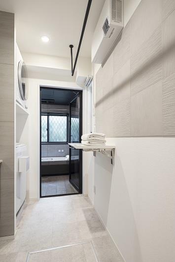 モノトーンで整えた洗面脱衣室。ガス乾燥機と必要な時に広げられる折り畳み式カウンターで家事効率がアップ
