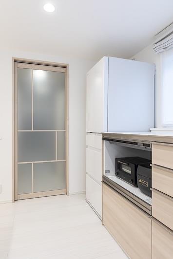 必要なものだけを見せる計算された収納計画。また、食洗機を開けても背面の食器棚の扉と干渉しない幅に拘った配置で片付けもスムーズに。