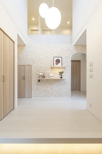 家族の記憶が宿る玄関は白を基調に一新。ホールはエコカラットの陰影とアーチの壁が優しく彩る空間に。