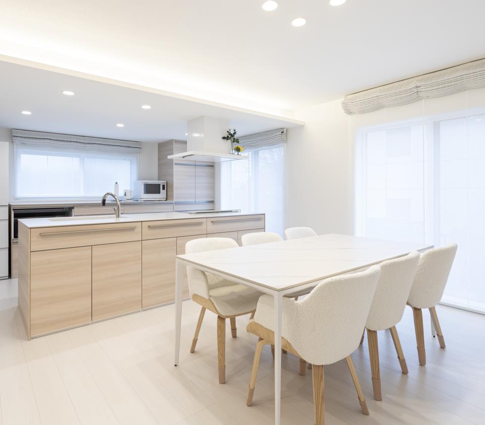 白を基調に生活感を抑えた素材を選び、上質感あふれる空間に。アーチ開口や照明計画が、やさしく洗練された雰囲気を演出